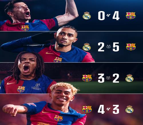巴萨官推也晒出球队本赛季4次面对皇马全部取胜的战绩,具体如下: