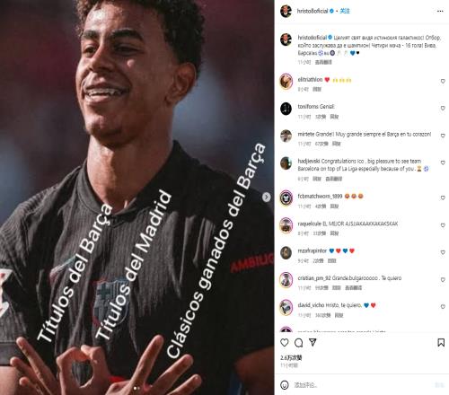 斯托伊奇科夫晒图以亚马尔手势讽刺:巴萨冠军数3、皇马冠军数0