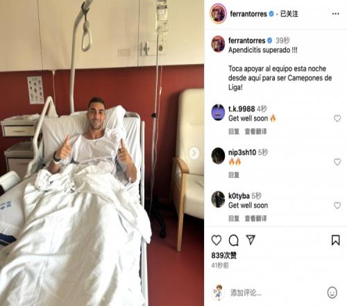 费兰-托雷斯社媒写道:“成功接受阑尾炎手术,今晚要在此全力支持球队,助他们加冕联赛冠军!”