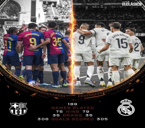 西甲官方晒国家德比战绩:巴萨75胜进306球,皇马79胜进305球