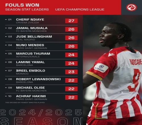 本赛季欧冠被侵犯次数榜:恩迪亚耶27次最多,穆西亚拉、贝林次席