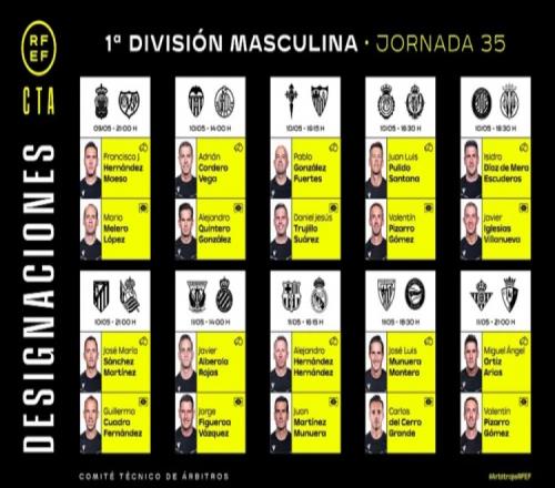 体育资讯5月8日报道宣称 西甲第35轮裁判公布,埃尔南德斯-埃尔南德斯执法国家德比。