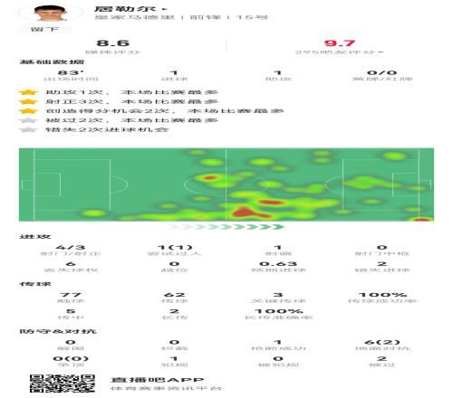体育资讯05月04日报道宣称 皇马3-2塞尔塔,居勒尔首发出场83分钟,为球队首开记录+助攻姆巴佩破门,全场比赛居勒尔获评8.6分!