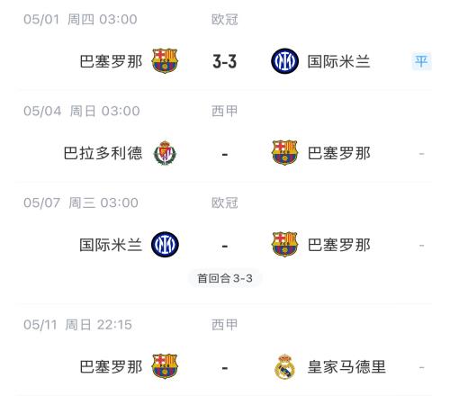 本周末巴萨将在联赛中客战巴拉多利德,5月7号客战国米,5月11号联赛迎战皇马。