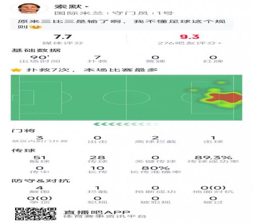 索默本场数据:7次关键扑救,4次解围,1次抢断,1次乌龙球