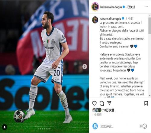 恰尔汗奥卢社媒晒出比赛照片,并写道:“下周,我们的主场在等待我们,团结一心。我们需要每一位国米球迷的力量。无论你们是在球场内还是家里观看比赛,你们的斗志都很重要。我们将一起战斗!”