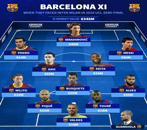 巴萨:巴尔德斯(1800万欧)、加布里埃尔-米利托(1400万欧)、皮克(2500万欧)、图雷(1800万欧)、阿尔维斯(3000万欧)、布斯克茨(2000万欧)、哈维(6500万欧)、凯塔(1600万欧)、佩德罗(1400万欧)、伊布(4600万欧)、梅西(8000万欧)