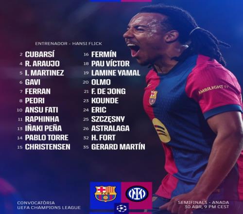 体育资讯4月30日报道宣称 北京时间明天凌晨,巴萨将在欧冠半决赛首回合比赛中主场对阵国米,巴萨公布了此役的球员名单,亚马尔、拉菲尼亚在列,莱万、巴尔德缺席,特尔施特根不在欧冠名单之中。