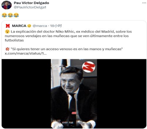 这些含沙射影的言论在社交媒体上迅速传播,很快传到了巴萨球员保-维克托耳中。维克托从青训时期就习惯用绷带缠绕右手腕和手掌,平时在社交平台不太活跃的维克托,用三个[笑哭]表情回应了前皇马队医的发言。