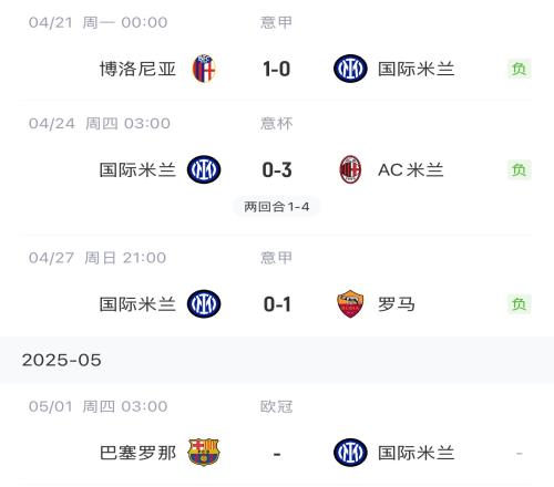 体育资讯04月27日报道宣称 本轮意甲国米不敌罗马,遭遇各赛事三连败且一球未进,包括意大利杯半决赛以及两场联赛。