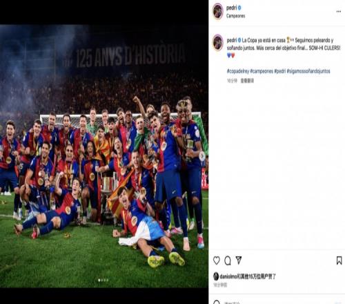 赛后,巴萨中场佩德里通过社交媒体晒出颁奖大合照:“国王杯已归诺坎普