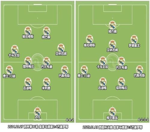 经历了联赛首回合的伯纳乌惨案之后,安切洛蒂放弃了心仪的442阵型,把贝林厄姆推向前场(罗德里戈升任主力)改打4231,此举曾一度为银河战舰带来了8场7胜1平的佳绩,却在西超杯决赛的大败后魔力尽失。安切洛蒂曾有意重启442阵型,却因中后场一直缺兵少将而只能作罢。此役,姆巴佩的身体状态很难踢满全场,意大利人没有安排卜拉欣-迪亚斯打首发,四中场架构重出江湖。