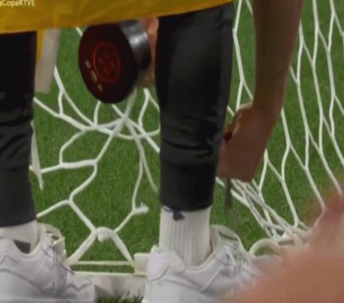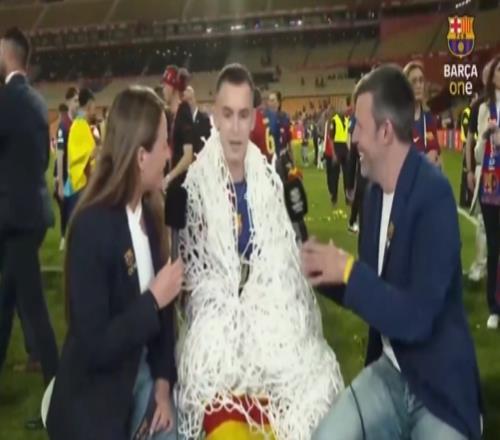 比赛结束后,卡萨多专心剪球网,随后还披着球网接受采访。