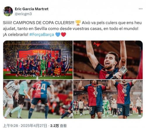 埃里克-加西亚社媒写道:“耶!国王杯冠军,巴萨球迷!奖杯献给所有支持我们的巴萨球迷,无论在塞维利亚现场,还是在世界各地的家中!让我们一起庆祝吧!”