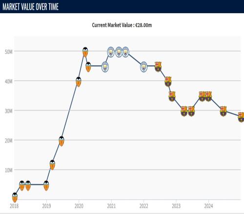 巴萨在2022年冬窗以5500万签下费兰-托雷斯,由于此前表现始终未能达到预期,球员身价从巅峰的5000万下滑至现在的2800万欧,若能保持出色状态,相信他的身价上涨也只是时间问题。