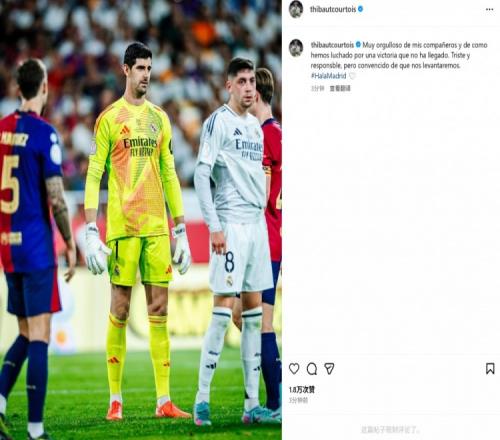 库尔图瓦赛后也在个人社媒发文鼓励球队,写道:“为我的队友感到骄傲,我们拼尽全力争取胜利可惜没能做到。感到难过和自责,但是请相信我们会再次站起来。”