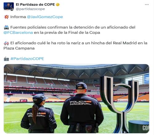 当地警方证实:国王杯决赛前夕,一巴萨球迷打断皇马球迷鼻子被捕