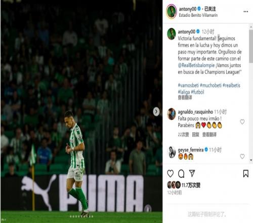 安东尼社媒晒出自己的赛场照片,配文:“一场关键的胜利,我们仍然坚定不移地战斗,今天迈出了非常重要的一步。很骄傲在贝蒂斯参与这段征程,让我们一起为欧冠资格而战!”