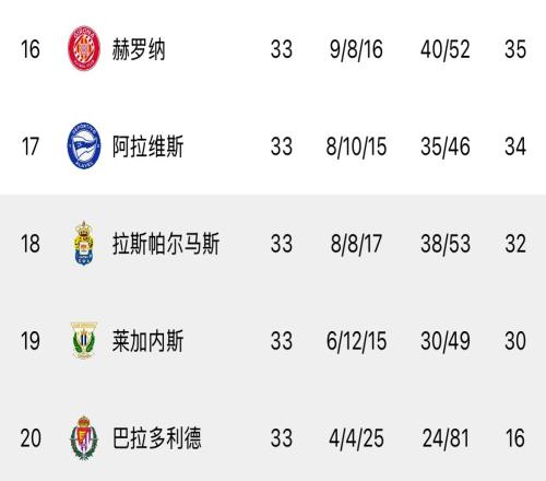 西甲方面,赫罗纳本赛季长时间位居下半区。从2月初西甲第23轮开始他们至今已11轮西甲不胜,排名一路从第8狂跌到第16。目前赫罗纳33轮35分,只领先降级区3分,最后5轮将迎来关键的保级战。