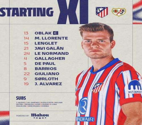 马竞VS巴列卡诺首发:小蜘蛛搭档索尔洛特,德保罗坐镇中场