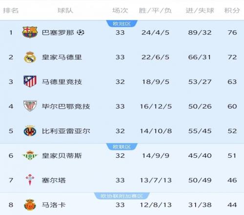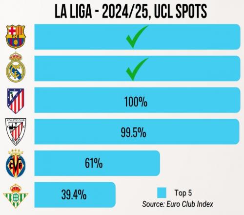 体育资讯4月24日报道宣称 数据媒体Euro Club Index预测了各队在西甲获得欧冠资格的概率,马竞100%,毕尔巴鄂99.5%,比利亚雷亚尔61%。