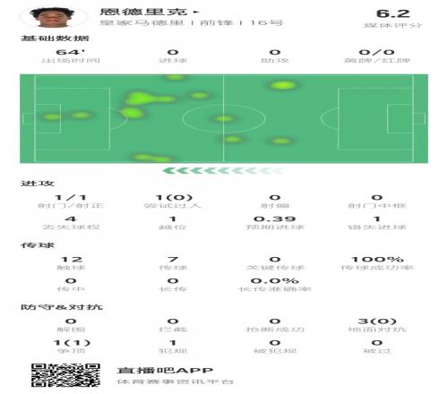 恩德里克本场数据:出场64分钟射门1次,错失1次机会&获评6.2分