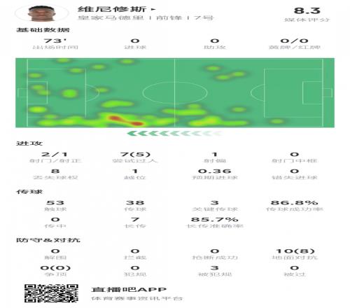 维尼修斯本场数据:5次过人成功,10次对抗8次成功&获评8.3分
