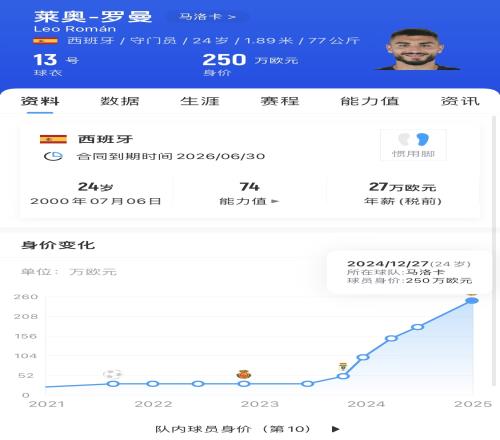 目前,罗曼的德转身价为250万欧,他与马洛卡的合同明年夏天到期。国家队方面,他代表西班牙U21出场过2次。