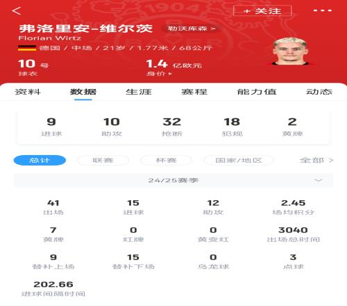 21岁的维尔茨本赛季为勒沃库森出场41次,打入15球12助攻,他的身价达到1.4亿欧元,与穆西亚拉并列德国球员最高。