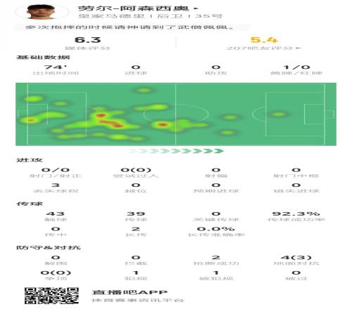 阿森西奥数据:犯规送点,解围、拦截、争顶挂零&6.3分首发最低