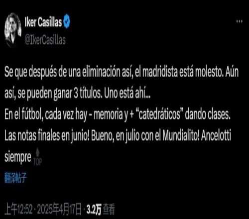 卡西写道:“我知道在这样出局之后,皇马球迷会感到失望。尽管如此,但球队仍有机会赢得三个冠军。其中一个已经触手可及……”