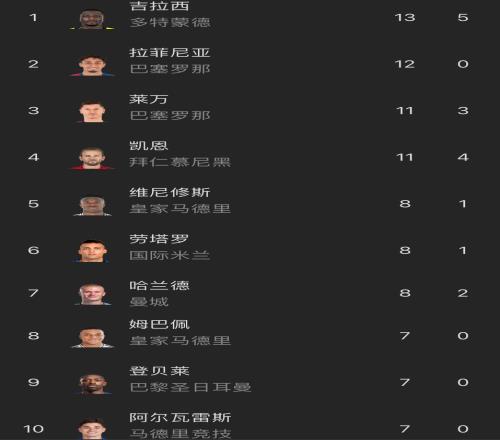 其中来自巴萨的拉菲尼亚(12球)和莱万(11球)独占四人中的前两名,其余两人分别是,来自国米的劳塔罗(8球)和来自大巴黎的登贝莱(7球)。