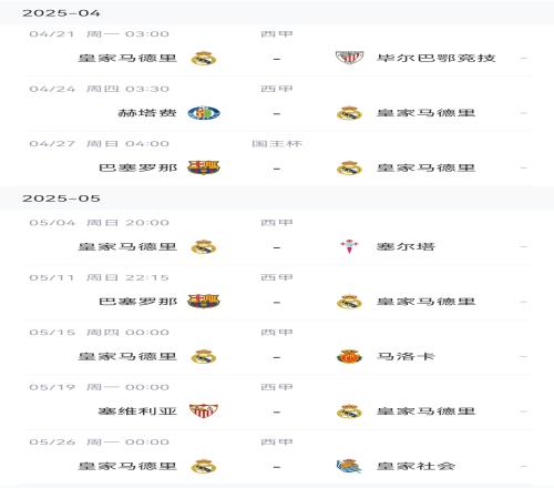 目前皇马已经从欧冠出局,球队联赛落后巴萨4分,4月27日,球队将与巴萨进行国王杯决赛的较量。
