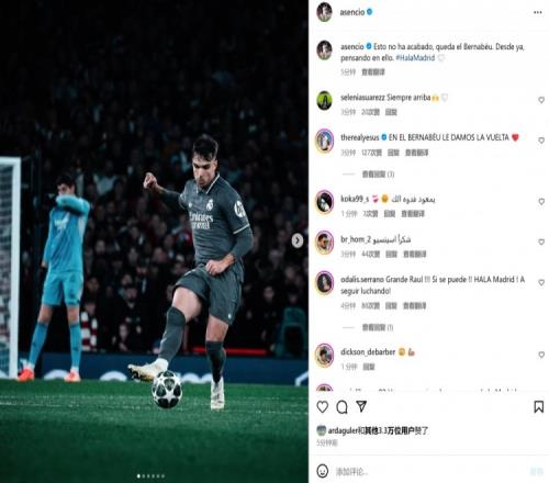 本场比赛劳尔-阿森西奥首发登场,赛后他也在个人社媒发文鼓励球队:“比赛还没有结束,伯纳乌仍保留着希望,已经在考虑下一场比赛了。”