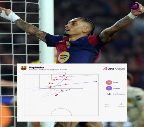 据媒体统计,拉菲尼亚本赛季欧冠参与19粒进球(12球7助),领先第二多的吉拉西5球,追平梅西在巴萨的单赛季欧冠参与进球纪录。