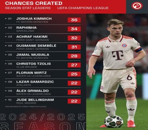 本赛季欧冠创造机会榜:基米希36次居首,拉菲尼亚34次位居次席