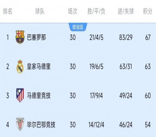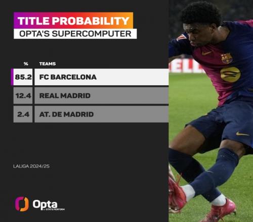 Opta预测西甲夺冠概率:巴萨85.2%、皇马12.4%、马竞2.4%