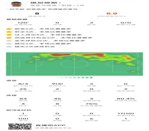 助攻双响!维尼修斯数据:8次射门3次射正,4次成功过人&获评8分