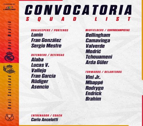 体育资讯3月31日报道宣称 北京时间4月2日周三凌晨3点30分,皇家马德里将在国王杯半决赛次回合主场对阵皇家社会,首回合皇马1-0取胜,今天皇马公布了次回合比赛日名单,具体如下: