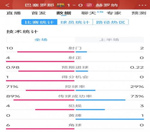 一球领先,巴萨vs赫罗纳半场数据:射门102,射正40