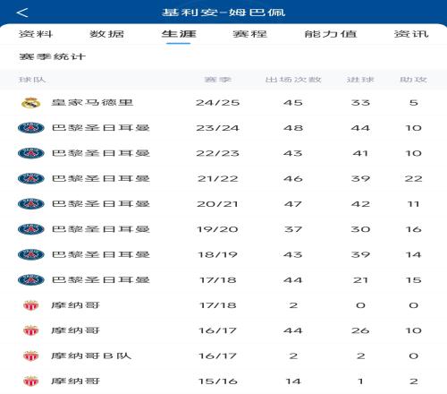 姆巴佩在皇马的首秀赛季进球数已达到33球,追平C罗的皇马首秀赛季。回顾姆巴佩职业生涯出道至今,他的表现一直都很不错,除了生涯首秀赛季15/16赛季。那年年仅17岁的姆巴佩在一线队只有1个进球。但是从随后的赛季开始,姆巴佩进球数从来没有低于20,且仅有前三个赛季低于30。