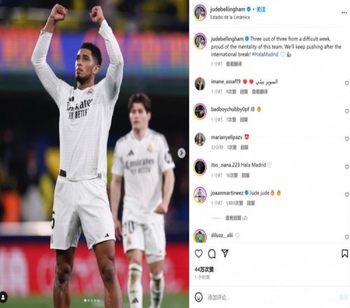3天内踢满210分钟!贝林社媒:一周3战,为球队的意志力感到骄傲