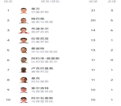 姆巴佩本赛季联赛进球数达到20球,仅次于21球的莱万,位居射手榜第二位。