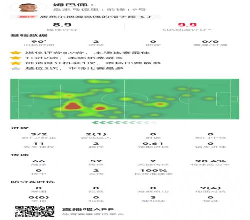 姆巴佩本场3射2正进2球2关键传球+3造犯规获评8.9分全场最高
