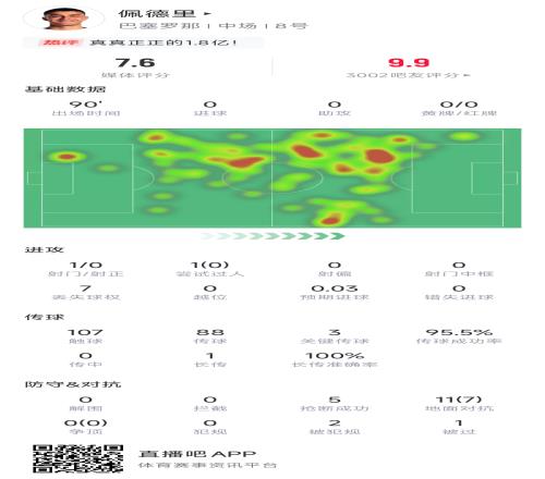 佩德里本赛季几乎全勤,只缺席巴萨一场比赛,他在41场比赛里贡献5球6助。不过进球数据并不能体现出佩德里的表现。例如他在本场比赛首发出战,贡献3次关键传球,触球107次仅有7次丢失球权,传球成功率达到95.5%,另外他还有5次抢断以及7次地面对抗成功。