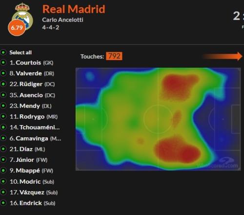 可以想到,因为在缺少大中锋的情况下,他们不可能按照过去有中锋时(哪怕是何塞-卢)那样的传中、抢点、后排套上争抢机会模式来打了。维尼修斯、罗德里戈、包括姆巴佩都是在突击方面远胜过被迫的站桩方面效率选手,因此,他们也会自主扯到边路来踢球。