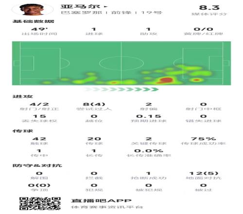半场技术统计数据显示,亚马尔奉献1球1助,他4次射门两次射正,8次过人4次成功,另外他还有两脚关键传球。