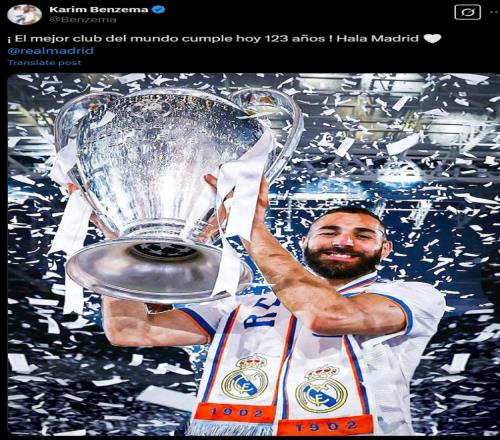 本泽马在社媒配文写道:“世界最佳俱乐部在今天迎来成立123周年纪念日,Hala Madrid!”