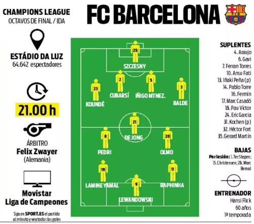 体育资讯3月5日报道宣称 巴萨将在今晚的欧冠1/8决赛首回合客场对阵本菲卡,《每日体育报》则对巴萨首发进行了预测,其中中场三人组将是奥尔莫、德容和佩德里。
