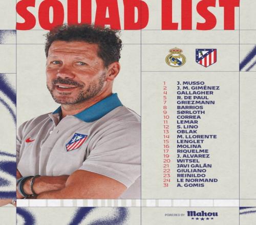 马竞公布战皇马名单:小蜘蛛&格列兹曼领衔锋线,德保罗坐镇中场